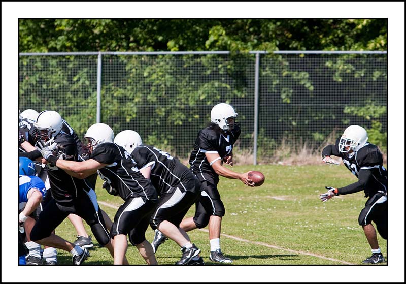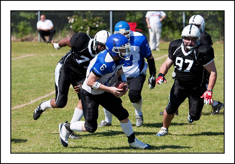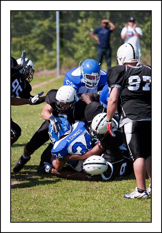 On Sunday 31st May 2009, I drove up to Peterborough where I photographed my second ever American Football match. br> I shot a game in London in the summer of 2008 & enjoyed it so much I wanted to try it again. It wasn't until this year that I got the opportunity. br> I contacted the club chairman to get permission to attend & arrived with 2 cameras - Canon 5D MkII & 20D, a 70-200mm f2.8, 100-400mm & 600mm lenses.