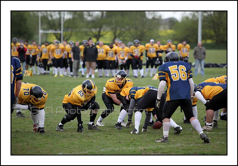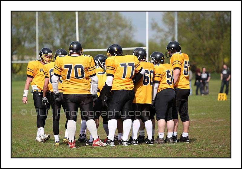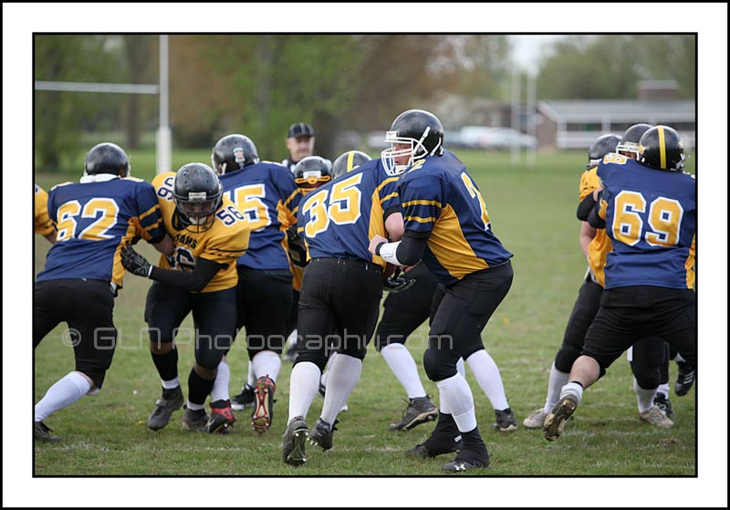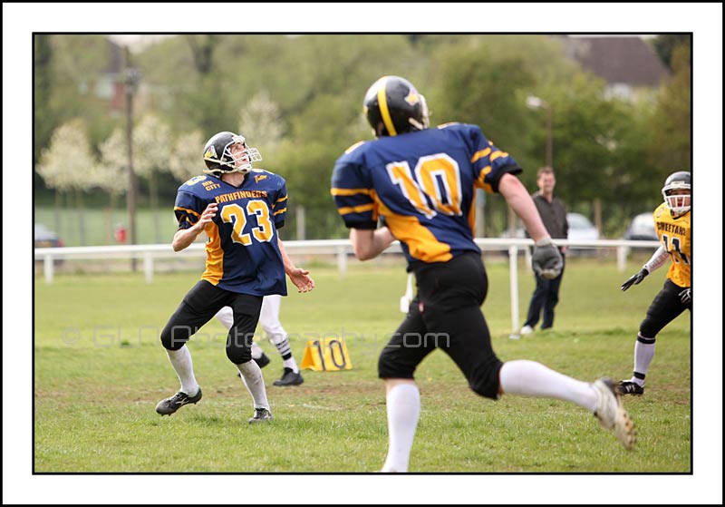 The game was dominated by the Defence on both sides & at half time the score was 2 - 0 to the Pathfinders. Things took a dramatic turn in the last quarter when Watford ran 3 pass interceptions back for touchdows, winning the game 28 - 2